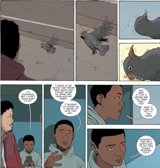 Not much dialogue and no narration. It really lets the images speak. Makes great use of the comic format. Unfortunately it is very graphic, which makes it hard to recommend. I don't know if it's just me, but the main character Sonny reminds me so much of Benedict Wong.