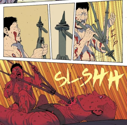 I think Remender peaked long ago. While cinematically illustrated and a departure from his usual Michael Bay bombast shoot ‘em ups, this is like Tarantino without all the humor, quirks, intelligence or heart. It’s depressing, indulgently grotesque, and at moments torture-porn. And perhaps most importantly, the characters are cardboard cutouts quickly whisked along the too-long pauses and blood-soaked firefights. I just didn’t care one bit.
