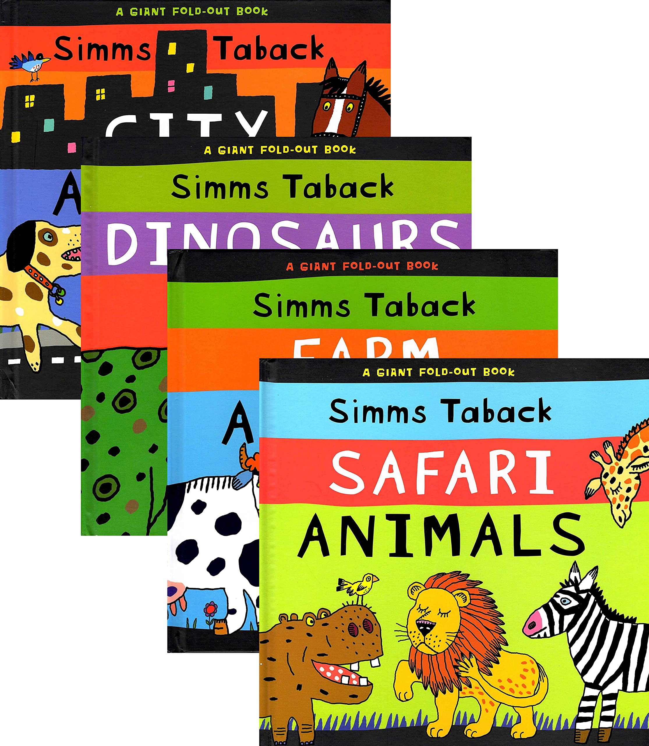 Four giant fold-out books in a set from Simms Taback. All four are in the animal theme and come City Animals, Farm Animals, Dinosaurs and Safari Animals.