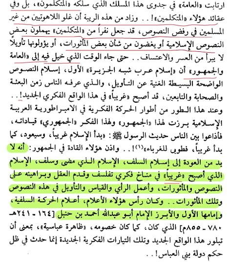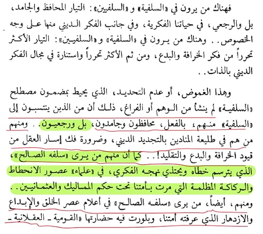 هذا الكتاب عبارة عن موجز عن السلفية الأسس التي تقوم عليها و أطوارها و نقد لمنهجها النصوصي -الذي يقدم النص على الرأي و القياس- و التناقض الذي وقعوا فيه بسبب هذا المنهج النصوصي .. و باستثناء تقديم النصوص الثابتة و القاطعة في الدلالة أجدني حائرة : كيف يقدم رأي ناتج عن عوائد و ظروف مكانية و زمانية سالفة على الرأي و الأجتهاد الذي ينبغي أن يتسق مع الظروف المعاصرة له !!