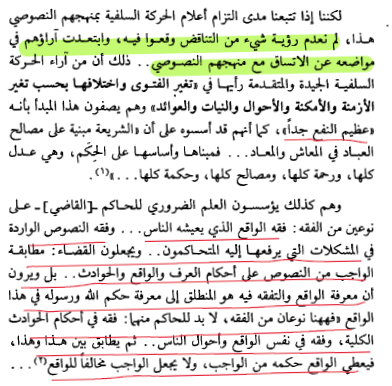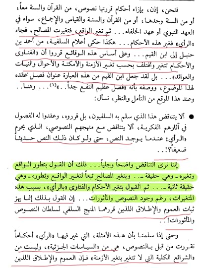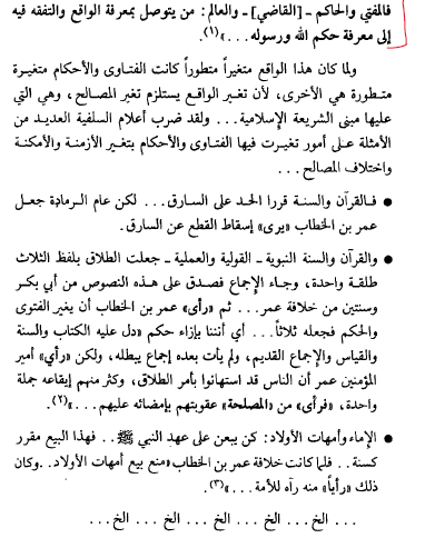 لا يفوت الدكتور عمارة الإشارة إلى التناقض الذي وقعت فيه السلفية عندما قالت بـ "تغير الفتوى واختلافها بحسب تغير الأزمنة والأمكنة والأحوال والنيات والعوائد" فالمفتي والحاكم والعالم هو من يتوصل بمعرفة الواقع والتفقه فيه إلى معرفة حكم الله ورسوله. ويقتضي تبدل الواقع تبدل الفتاوى لتبدل المصالح. وقد تتناقض المصالح مع النصوص بدليل عدم اقامة عمر بن الخطاب، لحد السرقة عام الرمادة، فتغلب الرأي (الذي يزدريه السلفية) على النص الذي يقسدوه!