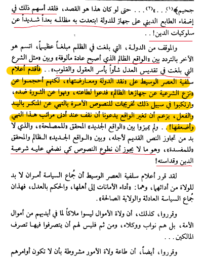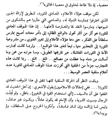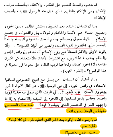 تحدث عن الثورة (الخروج علي الحاكم) فوفي وأقنع وأورد النصوص وبين الدلائل علي مجانبة الصواب في الاخذ بادني مراتب الإيمان في دفع ظلم الحاكم ..