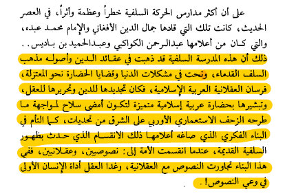 كتاب عظيم جداً، أجمل ما قرأت وأكثرهم وضوحاً وحياداً في عرض أفكار التيار السلفي بدأ الدكتور عمارة الكتاب ببيان معنى السلف لغة واصطلاحاً في معاجم اللغة وقواميسها من جانب ومن القرآن والسنة من جانب آخر ثم عرض لأهم أفكار السلفية وعقائدها بكل حياد وعدم تحيز، فذكر أقوال إمام السلف ابن حنبل وعرض لأفكار ابن القيم في السياسة والحكم، وآراء ابن تيمية وابن غقيل وغيرهم ووضع عدة نقاط توضح أفكار هذا المنهج المثير للجدل وكذا آراؤهم في الإيمان ومسألة خلق القرآن ومحنة ابن حنبل وصفات الله وخلقها ومسألة القضاء والقدر ورؤية الله في الآخرة والمسائل الغيبية وموقف أهل السلف من العقل والتفكير ومن التفلسف وإعمال العقل وإعطاء الرأي والقياس كما عرض لمسألة تعتبر من أكثر المسائل جدلاً وهي الكبائر هل هي تخلد صاحبها في النار كما قال الخوارج؟ أم أن الله يعذب أصحابها قليلاً ويخرجهم برحمته؟ أم بشفاعة نبيه وأولياؤه؟ كما تعرض سريعاً لمسألة الخلافة والفتنة بين الصحابة وموقف السلف منها، وهو السكوت والإعراض عن كل ما ليس لنا به علم اليقين ومسائل عدة أخرى تكلم فيها أعلام السلفية قديماً وحديثاً ووسطاً ومن أهم الأفكار اللي تعاطى معها عمارة بأسلوب الناقد الفاحص مسألة الخروج على الحكام، فأعلام السلفية وكتبتهم بلا إستثناء يرون بعدم جواز الخروج عليه أي الحاكم ولو كان ظالماً، ما دام لم يتعدى حدود الله !، وكأن الظلم ليس بالتعدي الكافي على حدود الله وأوامره، فالله يقول في العديد من المواقع في كتابه العزيز بتحريم الظلم والنهي عنه، كما يوجد في الأثر العديد والعديد من الأحاديث التي تحرم الظلم، وأحاديث أخرجها إمام السلفية الأول ابن حنبل رحمه الله، كمثل الحديث الذي أورده عمارة في آخر الكتاب على وجوب تقويم الإمام الحاكم بالسيف مادام تعدى حدود الله،ولكن السلفية اكتفوا بأضعف الإيمان وهو مقاومته بالدعوة القلبية فقط والنزوع إلى مقاطعة الفتنة والدعوة إلى طاعة الولي لما فيه من درء لمفاسد أكبر، وأعتقد إن الواقع خير دليل على تطبيقهم لأوامر أعلام شيوخهم من رضوح وتقبل للظلم وغيره عامة الكتاب في مجمله رائع وموجز جداً وأسلوب عمارة أكثر من رائع فهو لم يعرض لهم بسوء أبداً، بل اعتمد في جل كلامه على نصوص ومصادر من كتب السلف المتقدمين، بل وعلى العكس أرى أنه دافع كثيراً عن بعض أفكارهم وحاول الوقوف في المنتصف وعلى الحياد حتى لا يكون كدعاة عليه بالتجني وما شابه ذلك