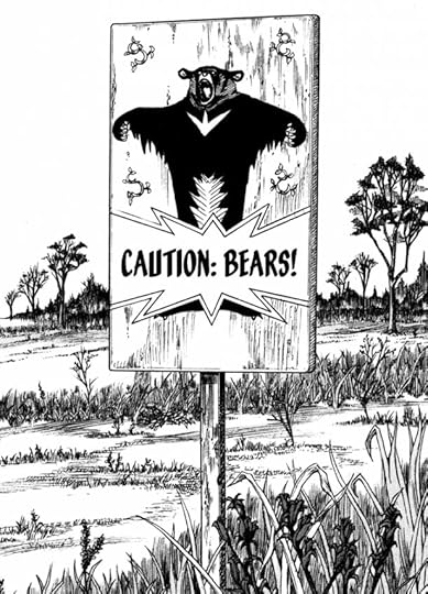 Araki's ability to write thrilling scenarios knows no bounds. A sign about bears in the area becomes threatening for reasons unrelated to bears!
