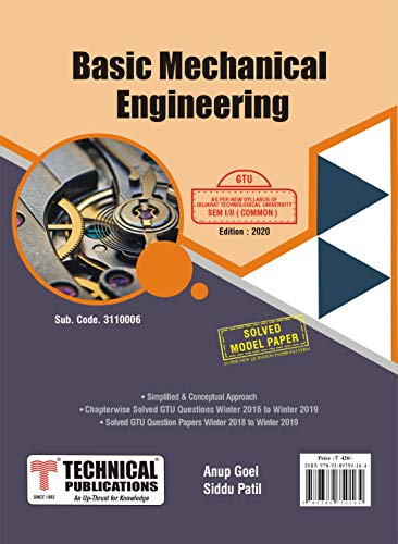 1. Prime movers and its types, Concept of Force, Pressure, Energy, Work, Power, System, Heat, Temperature, Specific heat capacity, Change of state, Path, Process, Cycle, Internal energy, Enthalpy, Statements of Zeroth law and First law. (Chapter - 1) 2. Introduction and applications of Energy sources like Fossil fuels, Nuclear fuels, Hydro, Solar, Wind, and Bio-fuels, Environmental issues like Global warming and Ozone depletion. (Chapter - 2) 3. Properties of Boyle's law, Charles's law, Gay-Lussac’s law, Avogadro’s law, Combined gas law, Gas constant, Relation between and , Various non-flow processes like constant volume process, constant pressure process, Isothermal process, Adiabatic process, Polytropic process. (Chapter - 3) 4. Properties of Steam formation, Types of steam, Enthalpy, Specific volume, Internal energy and dryness fraction of steam, use of steam tables, steam calorimeters. (Chapter - 4) 5. Heat Heat engine cycle and Heat engine, working substances, Classification of heat engines, Description and thermal efficiency of Carnot; Rankine; Otto cycle and Diesel cycles. (Chapter - 5) 6. Steam Introduction, Classification, Cochran, Lancashire and Babcock and Wilcox boiler, Functioning of different mountings and accessories. (Chapter - 6) 7. Internal Combustion Introduction, Classification, Engine details, four-stroke/ two-stroke cycle Petrol/Diesel engines, Indicated power, Brake Power, Efficiencies. (Chapter - 7) 8. Types and operation of Reciprocating, Rotary and Centrifugal pumps, Priming. (Chapter - 8) 9. Air Types and operation of Reciprocating and Rotary air compressors, significance of Multistage. (Chapter - 9) 10. Refrigeration & Air Refrigerant, Vapor compression refrigeration system, Vapor absorption refrigeration system, Domestic Refrigerator, Window and split air conditioners. (Chapter - 10) 11. Couplings, Clutches and Construction and applications of Couplings (Box; Flange; Pin type flexible; Universal and Oldham), Clutches (Disc and Centrifugal), and Brakes (Block; Shoe; Band and Disc). (Chapter - 11) 12. Transmission of Motion and Shaft and axle, Different arrangement and applications of Belt drive; Chain drive; Friction drive and Gear drive. (Chapter - 12) 13. Engineering Types, properties and applications of Ferrous & Nonferrous metals, Timber, Abrasive material, silica, ceramics, glass, graphite, diamond, plastic and polymer. (Chapter - 13)