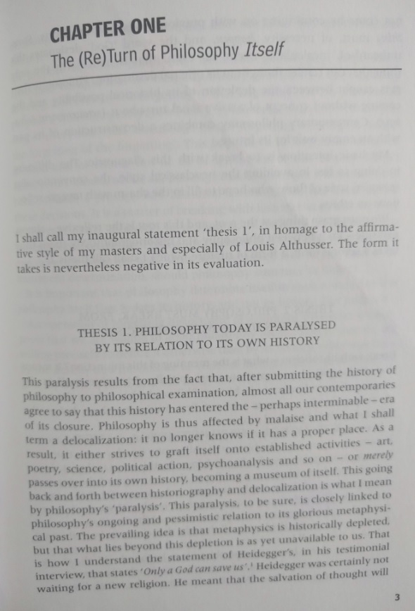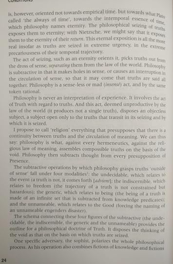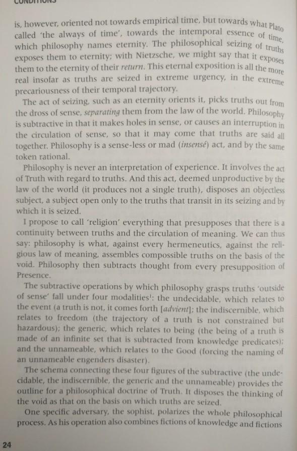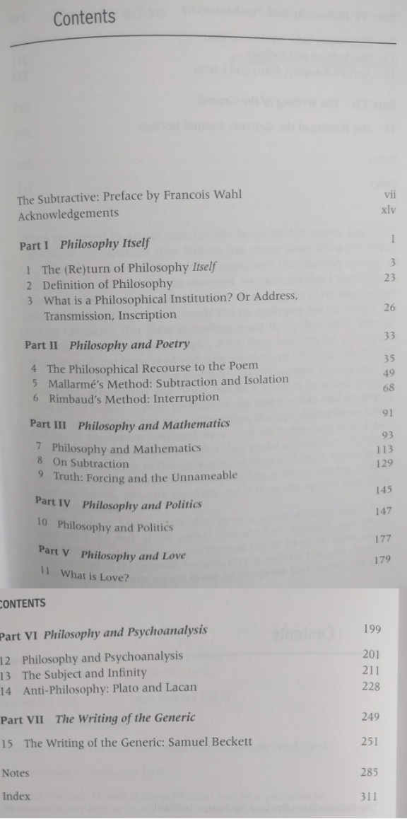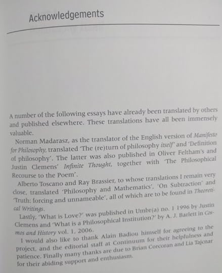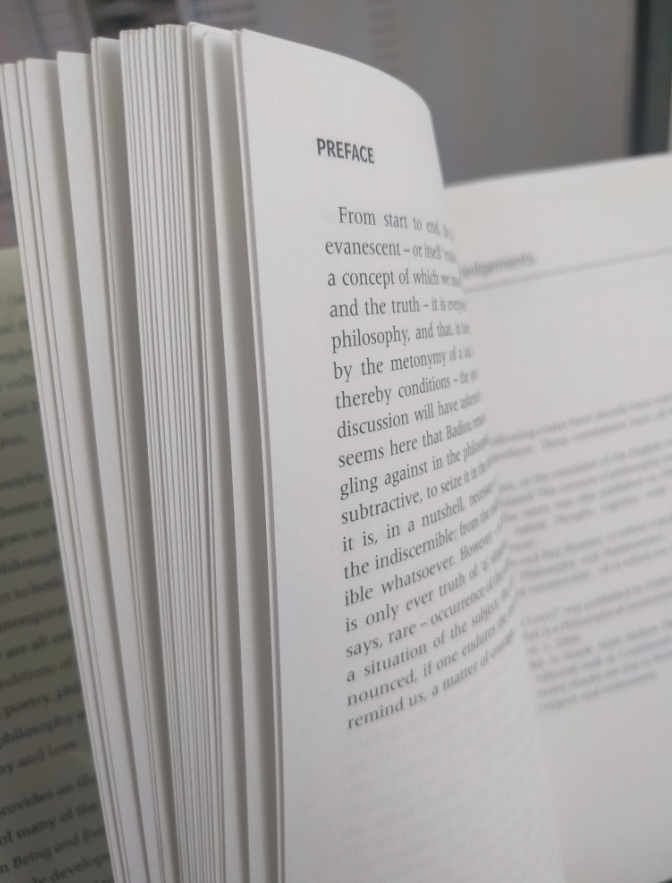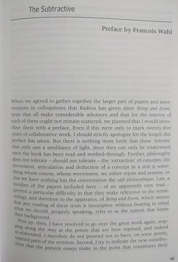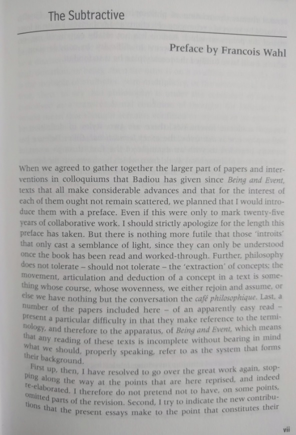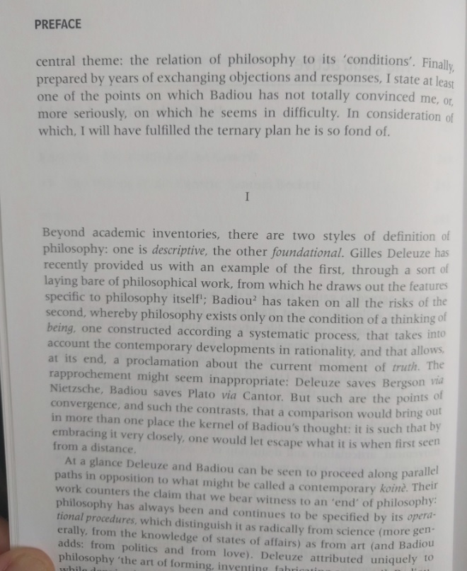 The preface. A long, long, long disertation on this author, his thoughts, and the preface's author vision of Badiou philosophy. What can I say? I tried, I promise.