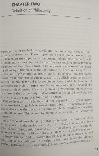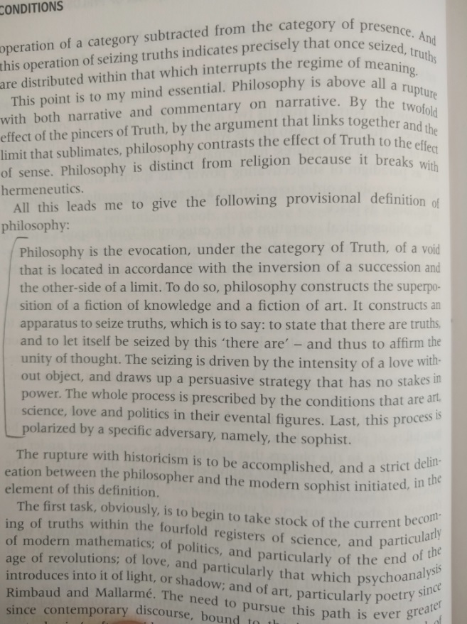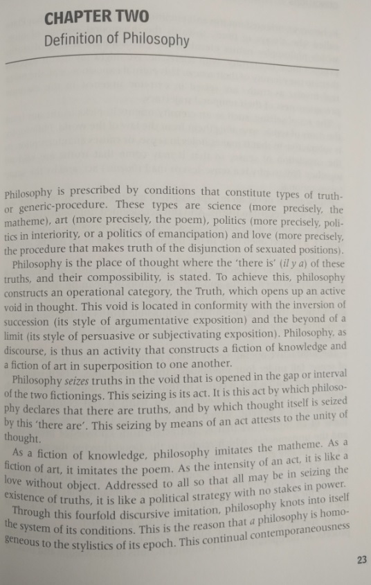 Here is a definition of philosphy. I really liked it: "Philosophy is the evoction, under the category of Truth, of a void that is located in accordance with the inversion of a succession and the other-side of a limit." Beautiful!