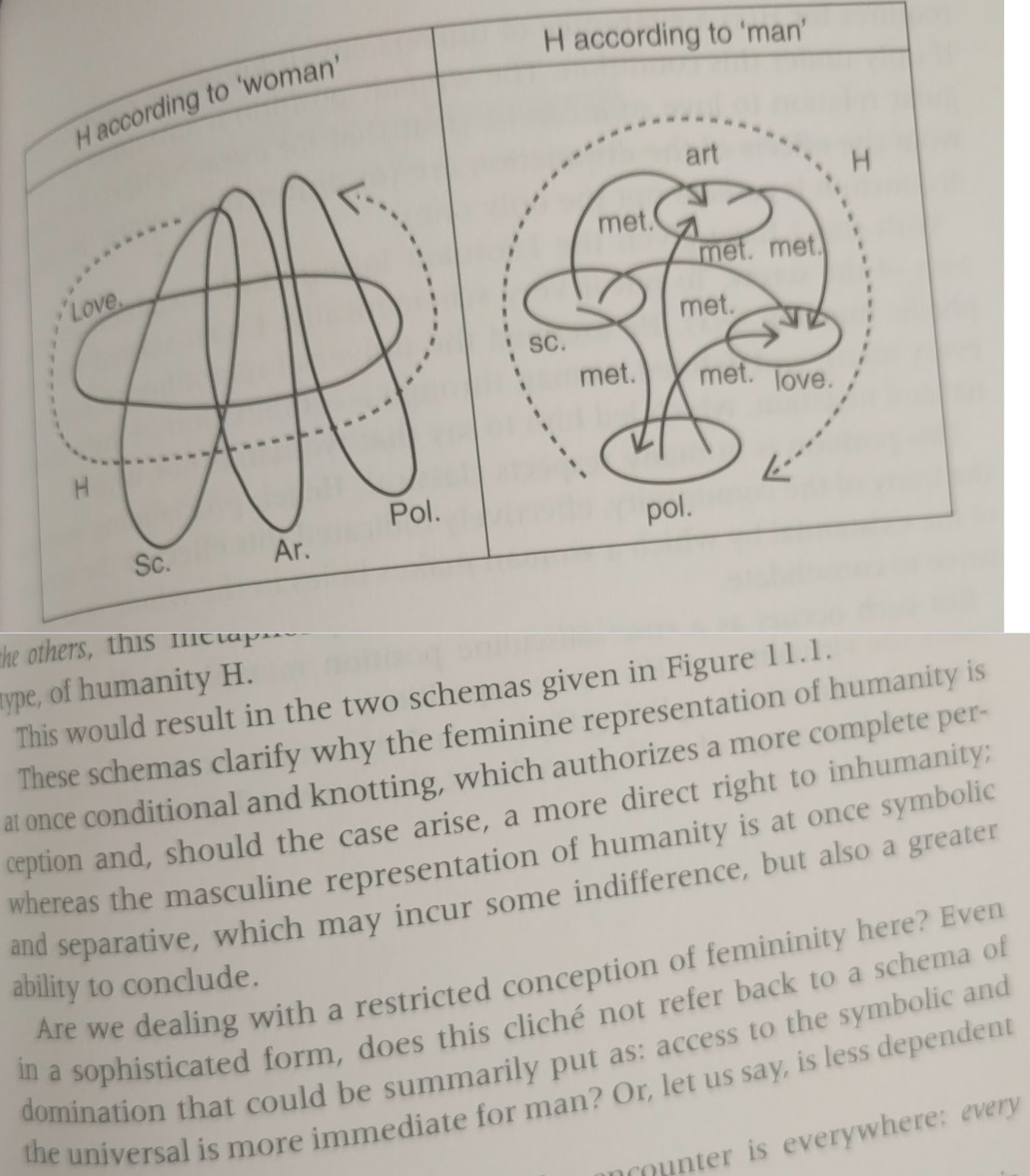 And my favorite diagram of the book: a comparison between men and women, on how they envision humanity. As you can see in the left, women see humanity as an oval layered with a simple rope; whereas the much more complex brain of men envision humanity as an intrincate network of connections. Everything is clear to me now.