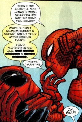 "DON'T TAKE OFFENSE, BUT DID YOU FORGET TO TAKE SOME MEDICATION TODAY OR SOMETHING?" - Spider-Man asking Deadpool the only question that should ever be asked of him.