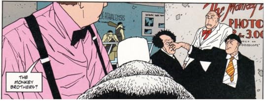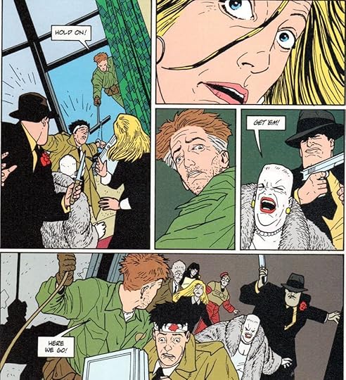 "Terminal City", de Dean Motter y Michael Lark, es una gozada. Sucede en un presente alternativo donde se mezcla el retrofuturismo y el noir, en el que flota una especie de "hauntología divertida" (el futuro que nunca llegó a ser que parecían anunciar las ferias de la ciencia del pasado, con robots atendiendo en los hoteles, arquitecturas demenciales, zeppelines sobrevolando la ciudad, etc). Alrededor del Hotel Herculean Arms conocemos a una serie de personajes insólitos, diferentes, todos ellos muy bien definidos y reconocibles por sus características. Entre sus protagonistas tenemos a Cosmo Quinn, en el pasado el escalador de edificios conocido como La Mosca Humana, caído en desgracia y actual limpiacristales, la recién llegada B.B., una joven sin familia ni amigos en busca de trabajo, la violenta gánster Li'L Big Lil o su incansable perseguidor, el capitán de policía Hbib. El detonante: un misterioso sujeto amnésico con un maletín esposado a su brazo incapaz de recordar nada de su pasado, y que hará que a su alrededor se desate una oleada de crímenes, aventuras, acción, combates de boxeo (hombre contra hombre, hombre contra mono, ¡hombre contra robot), y mucho humor. Aparte de un cómic que leí hace ya demasiado años y que tendría que releer más pronto que tarde basado en la serie "The Prisoner", no tenía en mi radar a Dean Motter más allá de oídas, especialmente por esta serie y por la inédita en España (creo, acepto correcciones y además me harían muy feliz) "Mister X". Ahora quiero leer más cosas suyas (de momento, la secuela "Terminal City: Graffiti Aéreo" ya está en mi poder). El dibujante, Michael Lark, hace un trabajo extraordinario, que recuerda un poco a los ochenteros cómics de Paul Smith para "X-Men" o "Dr. Strange". Y tiene un maravilloso uso del color, obra de Rick Taylor. Lo recomiendo encarecidamente.