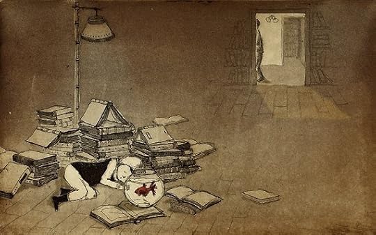 It's simply incredible that this magical picture-book was Taeeun Yoo's graduate thesis at the School of Visual Arts - talk about promising young students! With its simple tale of a boy, his fish, and a magical journey into the world of a book - Jeje accompanies his grandfather to his work, at the old library in the middle of the forest, bringing his little red fish with him; and, after awakening from a nap, must pursue his elusive piscine companion through the stacks, and into the pages of a dusty red book - The Little Red Fish is also a visual delight. Yoo's sepia-toned etchings, with their occasional flashes of red, reminded me a little bit of some of Edward Gorey's work, in their ability to evoke a world of mystery.