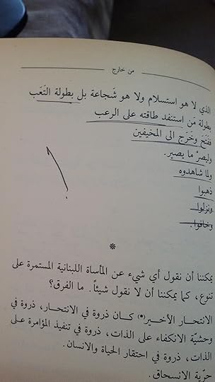 للخوف أيضا نهاية... لا النهاية السعيدة لا ... بل أيضا نهاية القدرة على الخوف يصل الخائف إلى آخر الخوف... وبجنون هادئ... يطلع من الاختباء كاشفا صدره وظهره ماشيا في عرض الطريق... يخرج إلى القتلة الذين ينتظرونه وحين يشاهدونه... يشاهدون روح مابعد الخوف... وجه ما بعد التجربة... الذي هو لا استسلام ولا هو شجاعة بل بطولة التعب من استنفذ طاقته على الرعب ففتح ورج إلى المخيفين وليصير مايصير ولما شاهدوه ذهبوا ... ونزلوا... وخافوا