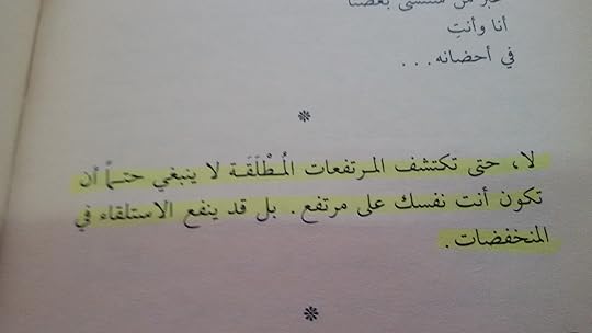 كم أنا بعيدة جدا لكنه رد علي وقال: "لا , حتى تكتشف المرتفعات المطلقة لا ينبغي أن تكون أنت نفسك على مرتفع. بل قد ينفع الاستلقاء في المنخفضات."