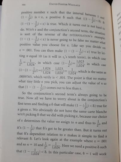 DFW keeps a very conversational tone throughout the book - peppering words like "stuff" around concepts like Fourier series and uniform convergence, which helps keep your attention without blunting the fidelity (can you blunt fidelity???) of the explanation. I also really enjoyed his extensive foot-noting, which I understand turns a lot of people off. DFW defended his footnotes in Infinite Jest on Charlie Rose, and I think the defense works very well for this book also:
