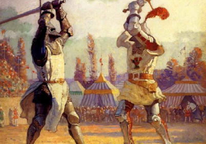 Although Conan Doyle's heart is with the English, he does depict along with his knightly Norman and Saxon heroes some chivalrous French and dastardly British (usually ugly of face or deformed of body). However, although Conan Doyle pays lip service to the chaos and ravages that the 100 Years War inflicted upon France, pointing out that Brittany was "the saddest, blackest land," rife with atrocities and brigands, he does rather treat it as his hero Nigel sees it, as a delightful country in which to achieve honorable advancement through knightly adventure, or, as he tiresomely repeats, to "win worship worshipfully," without ever sympathizing with how hellish it must be for the locals to have so many armies pillaging and killing back and forth across their countryside. For such men as Nigel, a truce between England and France is the worst news--which they deal with by indulging in a brutal 30 on 30 "joust" (combat on foot).