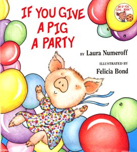 The premise of these books is that if you give the character something, it'll lead to a request for something else... and that will lead to a request for something else, and so on. In this book, it starts out with throwing a pig a party. And then she wants balloons. And then she wants to decorate the house...