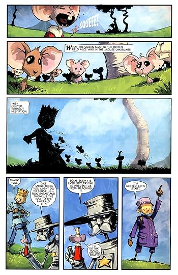 It’s been years since I read an Oz novel, yet I quickly fell into Marvel’s The Marvelous Land of Oz. I think the last one I read was something like Grandpa in Oz a good, oh, 17 or so years ago. It is the story of a little Gillikin boy named Tip, Jack Pumpkinhead, and the Sawhorse as they go on a journey across much of Oz, meeting faces both familiar and new and having quite an adventure. It took me no time at all to adapt to the wonky way logic and magic work in Oz, and the way the Scarecrow’s brains (he’s the wisest!) and the Tin Man’s heart (he has the best heart!) play such exaggerated yet…not exaggerated roles in the story. Broadly, Scarecrow’s wisdom sometimes makes sense in our world, and when it doesn’t, it somehow fits into the Land of Oz. Perhaps one of my favorite scenes happens early on, when Jack Pumpkinhead from the country of the Gillikins visits the Scarecrow in the Emerald City. They “realize” they need a translator since Pumpkinhead is a foreigner in the Emerald City, and as such he clearly must speak a different language than the Scarecrow. I loved the absurdness of it, and how it shakes out from there. (Yes, you’ll just have to read it to find out for yourself!) The story is full of this, and I’m pretty sure that Mr. Shanower pulled lines directly from L. Frank Baum’s text. Despite the years it has been since I really read a Baum Land of Oz novel, I was sent right back to the world he created in this adaptation. And you know, now I rather want to pick up the couple random Oz novels I know we have in the house to read them. It’s a distinctly almost-Alice-in-Wonderland kind of absurdness, yet Oz doesn’t go quite as far into absurdity as Wonderland. But it’s pretty close. As for the art, I definitely must spare a few words to address it directly. Mr. Young’s style quickly grew on me so thoroughly that it felt like the perfect art style to portray such a wacky world which somehow manages to make sense in its own kooky way. He had me a few scant pages into the story, his style quickly becoming The Style for at least this Oz book, and quite possibly a solid style for many Oz books. All in all it makes for a very fun read, and an enjoyable way to (re)visit the land and stories of Oz. Now, how easily accessible are the Oz books we own…?