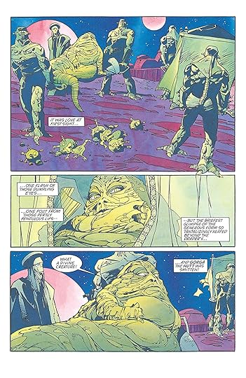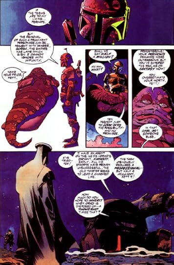 In this graphic novel, there are Hutts in love who hire Boba and that's basically the only world-building you need to know. He fights pirates and blows things up a lot, it's pretty funny and not supposed to be particularly deep. I also enjoy the art by Cam Kennedy who did Dark Empire and it works great for this aesthetic. Very different from a superhero comic, well-executed storytelling, stylistic with just enough detail for weird space opera.