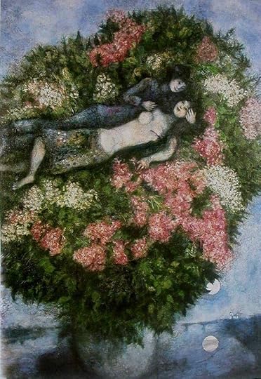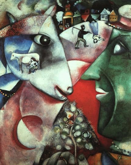 I love poetry and I love Marc Chagall. There's something piquant and adorable about him. His art is a fable; it reminds me of Cherries in the Snow or the Adante stories of Marly Youmans. It hits my spot which is very particular and always hungry. Like the mad play of children it is beyond thought and beyond feeling and belongs to a certain fugue state that is intensely sweet - as if heaven touches earth.
