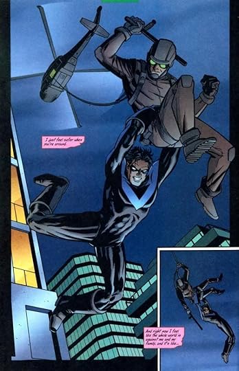 Devin Grayson penned the entire trade paperback. For the most part, it is written moderately well, although it may not be entirely her fault. As I read the series from the trade paperbacks, the skipping over of forty or so issues is devastating. Firstly, Dick Grayson is injured, an ex-cop, his relationship with Barbara Gordon is over, and he is involved in Blockbuster’s murder – it’s all too much to skim over. However, Grayson did a passable job of having Dick Grayson infiltrating a mob family undercover the end it from within.