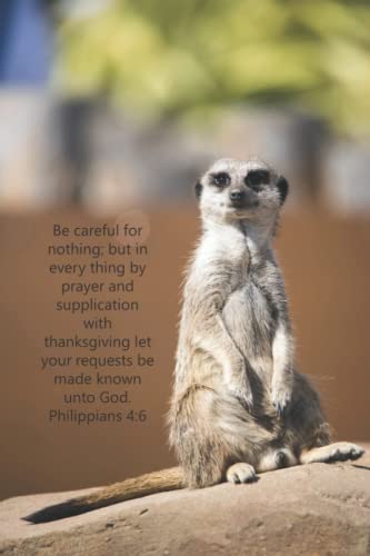 Bible Text Lined Notebook - 110 lined pages - Journal/Notebook - 6" x 9" - softcover Be careful for nothing; but in every thing by prayer and supplication with thanksgiving let your requests be made known unto God. Philippians 4:6 Meercat Picture Cover