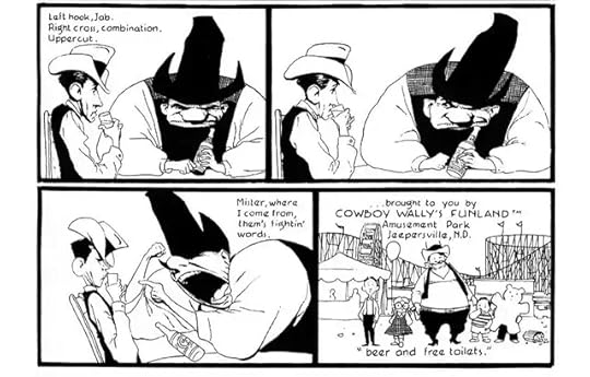 The writing won't appeal to everyone, but I found a lot of the gags and jokes laugh out loud funny. During a bit about Cowboy Wally's brief stint as a news caster, Baker draws two panels depicting the show: "Today's big story, Mayor Fenton Hubley was killed today in a tragic plane crash." "On the lighter side of the news, I never liked him anyway." During a rewrite of Hamlet, a palace guard,Francisco, is talking to another guard, Bernardo, about the King's death: "accidental death, says the Queen. The King fell on his sword." "Wow." "Eight times." "Sounds fishy to me." "Hey, I don't see nothing, I don't hear nothing. That's what they pay me for." "You're the palace guard." "And I want to keep it that way." Cowboy Wally's brief stint in jail is pretty typical of the kinds of jokes that run through the book: