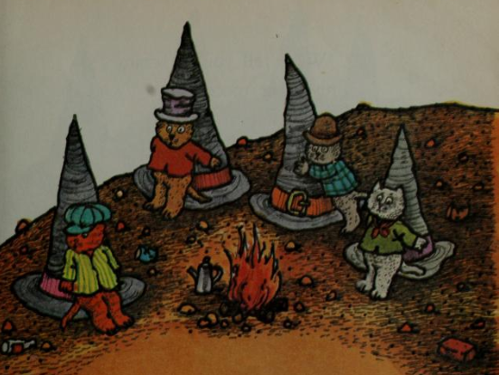 This is a very short full-color, fully illustrated rhyming picture book that's beyond cute. Four witches are flying upside down and their magic hats fall off. They search and find that four anthropomorphic cats are living in them. "It's raining houses!" said the cats. "How nice." They moved right in and dined on mice." The cat's won't give the hats back but the witches win in the end and the cats go with them.