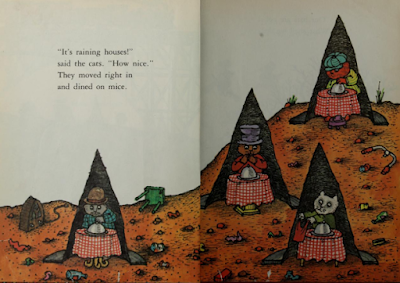 First published in 1980, this witchy picture-book from Marc Brown - creator of the immensely popular Arthur series, which I believe has also been turned into a television show - is told in rhyming verse, and accompanied by amusing and slightly off-kilter illustrations. When four witches lose their hats, while zooming around upside down on their brooms, four cats find them, and turn them into houses. But who will get to keep them, when the witches come to reclaim their lost property...?