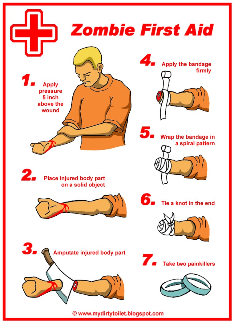 Menurut primbon perzombian, pertolongan pertama yang harus dilakukan kalau kita kena gigit zombie adalah seperti ini: