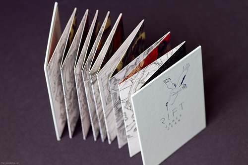 Rift is an unique book, designed in an accordion-book format. The book is about the size of a palm and comes with a beautiful slipcase.