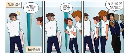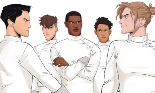 I had not expected to like this first volume of a comics series about all-boys high school fencing, but I did, a lot. I do like sports, but know nothing about fencing, and the only reason I read it is because it is one of the 2018 Goodreads award nominees for graphic novels/comics. Then, to top it off, it is a story of 1) all boys (how revolutionary, in a time of Monstress, Bitch Planet, and so many girl-centric comics! With one exception: a woman coach, who is awesome!)); 2) rich, privileged boys either at or hoping to get into a boy's private school 3) that fencing competition focus.