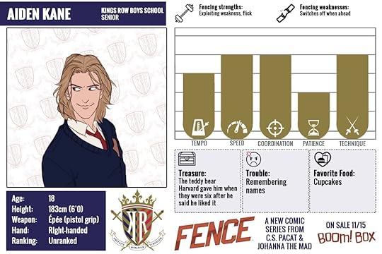 The entire volume is honestly just perfection. I got to root for a lovable underdog, rage at a hate-worthy-brooding-arrogant-jerk antagonist, learn a little about fencing, and get wholly sucked into this little universe to the point where I'm already dying for volume 2 to release. I will probably read and recommend everything Pacat ever writes, and Fence is no exception.