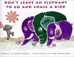 A story from Ghana, Africa with a message of the power of greed. Anancy Spiderman goes out into the village one day and trades with the locals. At first it seems Mr. Spiderman is very helpful, always coming upon a person who just so happens to need what he has to trade. Then he comes upon a group of elephants and all he has to trade is a sack of flour for which the elephants have no use. Wary of Anancy Spiderman, but not wanting to be rude, they make a bet(which they thought was safe) that if all the elephants jumped over the river, Anancy could have one if it were to fall in. The baby elephant did fall in, but Anancy got distracted by a bird and wandered off. When he finally remembered to claim his elephant, it and the flour had disappeared, leaving him with nothing.