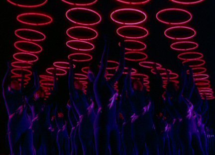 Some neon hoops are lowered from the ceiling on obviously visible wires. The wires have to be cut loose instantly so the women can pull down the hoops to begin twirling them around. For the neon hoops to actually work, they have to be wired to a power source (yes, they were not independently powered). This means the women were literally wired to the hoops with the cord running down their arms through their costumes into a hidden hole in the floor. I get all of that. But how did they maintain the electrical circuit in the hand-off when the hoops are pulled down from the ceiling? Probably a very simple trick but I haven't figured it out. Actually, the electrical cords might actually be on the women the entire time and are being pulled down through their suits as the hoops are lowered on the strings. That means the strings had to be cut, which seems tricky to do in the split second this happens. Hollywood ingenuity, truly.