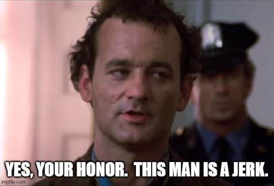 Why? What was the point of such inane changes? It can't be because vulgarity wasn't allowed in his contract, because he uses "ass" at least once. After Walter Peck has the power shut off, everything goes to hell in a handcart. They're standing outside, and "Peter Venkman had nothing to say. He simply turned and knocked Walter Peck on his ass." But you'll never find it in the dialogue. "Damn" was even altered in one scene that isn't in the movie. Ghosts have wreaked some havoc at a movie theater and the screen goes black. One of the moviegoers shouts "You jerkbag, fix the demn theng."