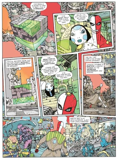 Big bold science fiction with a 1970's kind of feel. Not for all readers, the art might be more of acquired taste, but a lot of fun. The story once started never stops moving, and every page offers either a surprise, a what the heck is that, or that must have taken a while to draw. Lots of fun.