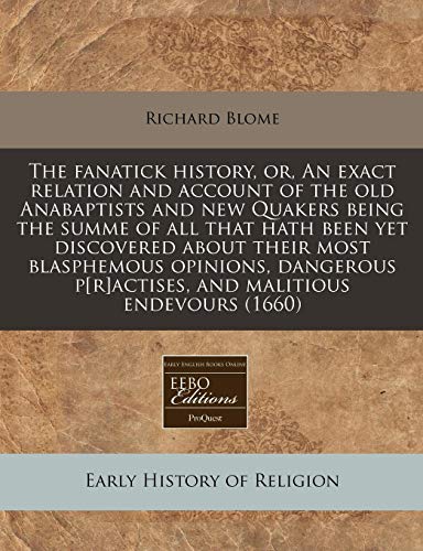The fanatick history, or, An exact relation and account of the old Anabaptists and new Quakers being the summe of all that hath been yet discovered about their most blasphemous opinions, dangerous p[r]actises, and malitious endevours Blome, Richard, d. 1705. [8], 224 p. : London : Printed for J. Sims ..., 1660. Thomason Coll. / II 325 Wing / B3212 English Reproduction of the original in the University of Chicago Library
