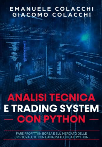 Scopri l’Analisi Tecnica, come costruire un Trading System e come renderlo profittevole con l’implementazione di un semplice programma scritto da te in Python! Se conosci cosa sia l’Analisi Tecnica e già sfrutti dei Trading System performanti, con questo libro impari a trarre maggiori profitti grazie alla potenza di Python. Se hai studiato l’Analisi Tecnica ma non sai o non l’hai mai applicata per la costruzione di Trading System , questo libro ti guida passo passo, illustrandoti modi e metodi con cui costruire le tue strategie di trading e ottimizzarle con l’ausilio di Python. Se non conosci l’Analisi Tecnica no problem, questo libro ti accompagna alla scoperta di questo favoloso strumento per la definizione delle decisioni di operatività finanziaria. Alla fine della lettura di questo libro conoscerai le principali distinzioni tra gli indicatori dell’analisi tecnica, i principali indicatori utilizzati nel trading, come raccogliere dati finanziari e graficarli con dei semplici codici in Python, come costruire i tuoi trading system e come testarli e ottimizzarli grazie al motore di backtesting interamente sviluppato da noi autori. Specializzati nell’Analisi Tecnica e nei Trading System con l’implementazione di Python per operare con profitto nei mercati finanziari e nei mercati delle criptovalute! Per una rapida comprensione dei codici mostrati è propedeutico aver acquisito le basi di Python con il libro Python per il Trading .