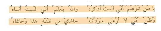 :وقال لرسوله اقرأ سلامي على من لا أسميه // ومن بروحي من الأسواء أفديه ومن أعرض عنه حين أذكره // فإن ذكرت سواه كنت أعنيه أشر بذكري في ضمن الحديث له // إن الإشارة في معناي تكفيه واسأله إن كان يرضيه ضنى جسدي // فحبذا كل شيء كان يرضيه أَحبَبتُ كُلَّ سَمِيٍّ في الأَنامِ له // وَكُلَّ مَن فيهِ مَعنىً مِن مَعانيه يَغيبُ عَنّي وَأَفكاري تُمَثِّلُهُ // حَتّى يُخَيَّلَ لي أَنّي أُناجيهِ فَيارَسولي تَضَرَّع في السُؤالِ لَهُ // عَساكَ تَعطِفُهُ نَحوي وَتَثنيهِ إِذا سَأَلتَ فَسَل مَن فيهِ مَكرُمَةٌ // لا تَطلِبِ الماءَ إِلّا مِن مَجاريهِ