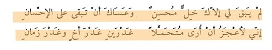 لا تعتب الدهر في خطب رماك به ،، إن استرد فقدما طالما وهبا حاسب زمانك في حالي تصرفه ،، تجده أعطاك أضعاف الذي سلبا والله قد جعل الأيام دائرة ،، فلا ترى راحة تبقى ولا تعبا ورأس مالك وهي الروح قد سلمت ،، لا تأسفن لشيء بعدها ذهبا