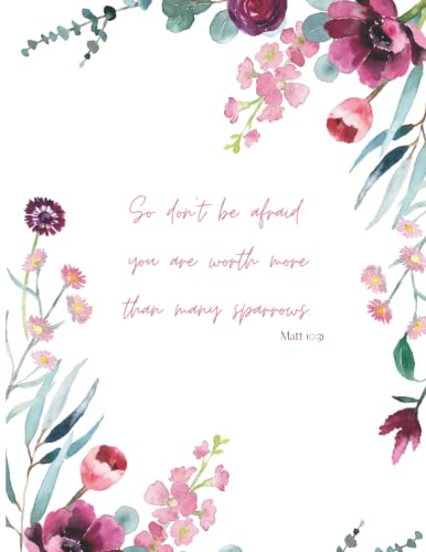 So don’t be afraid; you are worth more than many sparrows. Matt 31:10 Lined journal notebook with pink flowers and scripture. Perfect for gift giving, church notes, and journaling.
