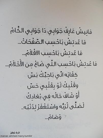 تحفة .. تتحفة .. تحفة ديوان عبقري بمعنى الكلمة مفعم بالاحساسيس و المشاعر الصادقة القوية ديوان قدر انه يخليني ادمع بجد و اتأثر اوي بكل الكلام اللي فيه كلام واقعي و بسيط و قريب من القلب و يدخل القلب بسرعة و بسهولة مرسال لحبيبتي لما سمعتها لمسار اجباري مكنتش اعرف مين اللي كاتبها و كنت بقول مين العبقري اللى كتبها لحد بالصدفة لما شفت الكتاب و قابلت اشرف توفيق و وقعلي على نسختي من المرسال اكتر القصايد اللي عجبتني ( مرسال لحبيبتي , استحملي , لو سمحتي , ناقص دبدوب ) و كل القصايد فعلا كانت مبهرة .. اتمنى اقراله ديوان تاني شعر عامية.