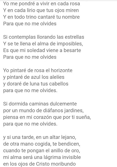 Ne ricopio una sola, che forse è la più importante: "e se contempli piangendo le stelle e ti si riempie l'anima di impossibili, è la mia solitudine che viene a baciarti". Sospetto si tratti di una poesia di Oscar Castro: vado a verificare e così facendo scopro che Para que no me olvides è effettivamente il titolo di una sua poesia.