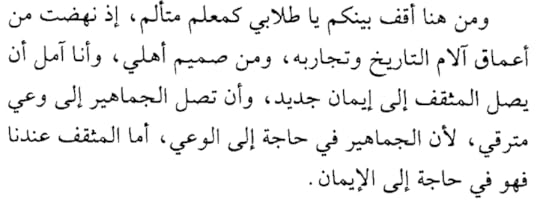 من هنا أقف بينكم يا طلابي كمعلم متألم، إذ نهضت من أعماق آلام التاريخ وتجاربه، ومن صميم أهلي، وأنا آمل أن يصل المثقف إلى إيمان جديد، وأن تصل الجماهير إلى وعي مترقي، لأن الجماهير في حاجة إلى الوعي، وأما المثقف عندنا فهو في حاجة إلى الإيمان.