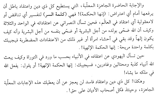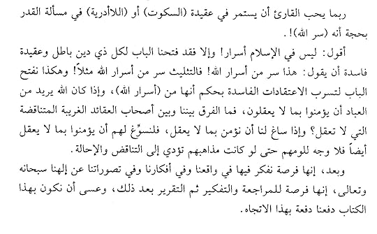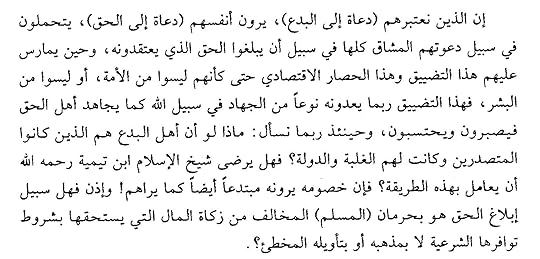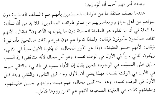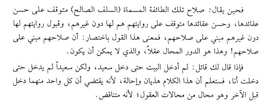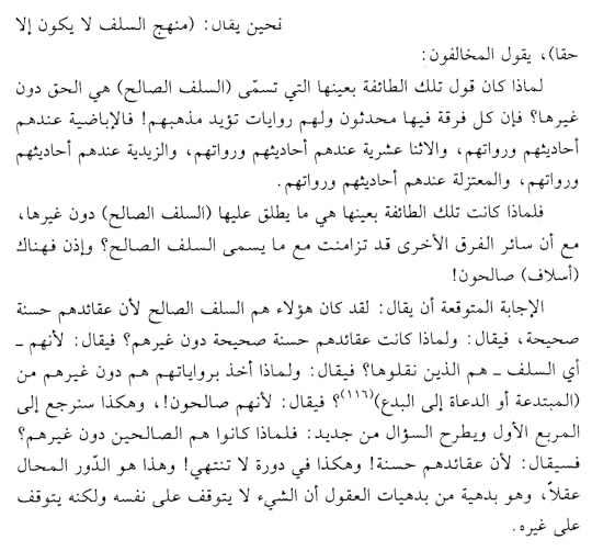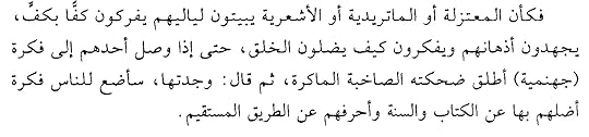« فكأنّ المعتزلة أو الماتريدية أو الأشعرية يبيتون لياليهم يفركون كفا بكف، يُجهدون أذهانهم ويفكرون كيف يضلّون الخلق، حتى إذا وصل أحدهم إلى فكرة ( جهنّميّة ) أطلق ضحكته الصاخبة الماكرة، ثم قال: وجدتها ! سأضع للناس فكرة أضلّهم بها عن الكتاب والسّنّة وأحرّفهم بها عن الطريق المستقيم. »