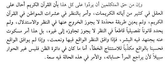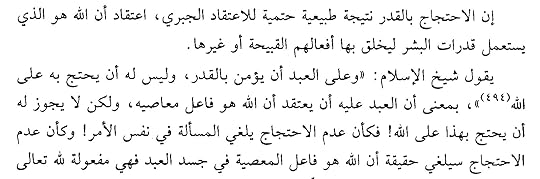« يتبرّأ من الإقرار بأن الإنسان قد ينفرد بتأثير أو بابتداع أو اختراع، ويعزو هذا القول إلى أهل الضّلال ويعني بهم المعتزلة. »