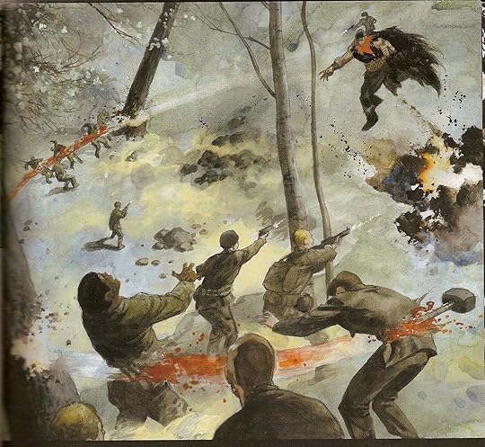 The squatting monkey-like creature yells out, "NHHHH." Then the caption mentions it being Loki's Dwarf! What kind of a way to start a comic is that and that thing is definitely not a Dwarf...unless it was tossed through a blender or something. Then the American soldier says, "Dig it, daddy-o! There's an AES over by the scope, dope." Holy f**k, did he actually just say that? That's some bad dialogue right there and furthermore, that's beatnik slang from the 50's...not a US soldier in WWII! But the slang keeps on going and it's really hard to get past! This book is pretty, with some great art and splash pages, but that's really all. The story is a jumble and it's all over the place and hard to get through. The biggest problem this book suffers from is it's long-windedness. I made it less than halfway before I just flipped through and looked at the purdy pictures.