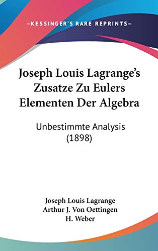 Das Buch ""Joseph Louis Lagranges Zusatze zu Eulers Elementen der Unbestimmte Analysis (1898)"" von Joseph Louis Lagrange ist eine Sammlung von Erg�����nzungen zu Leonhard Eulers ""Elementen der Algebra"". Lagrange, ein bekannter Mathematiker des 18. Jahrhunderts, hat diese Erg�����nzungen verfasst, um die L�����cken in Eulers Werk zu f�����llen und den Lesern ein umfassenderes Verst�����ndnis der Algebra zu vermitteln. Die Erg�����nzungen behandeln Themen wie unbestimmte Analysis, komplexe Zahlen und Determinanten. Das Buch ist ein wichtiger Beitrag zur Geschichte der Mathematik und ein unverzichtbares Werk f�����r alle, die sich mit Algebra besch�����ftigen.This scarce antiquarian book is a facsimile reprint of the old original and may contain some imperfections such as library marks and notations. Because we believe this work is culturally important, we have made it available as part of our commitment for protecting, preserving, and promoting the world's literature in affordable, high quality, modern editions, that are true to their original work.