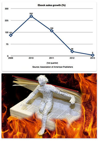 لكن الإحصاءات الحديثة بينت أن هذا الصعود العاصف لم يكن سوى طفرة عابرة رافقت الانتشار السريع الأجهزة اللوحية والهواتف الذكية . فبحسب تقرير اتحاد الناشرين الأمريكيين AAP ، هبط نمو المبيعات في عام 2011 إلى 159% ثم إلى 28% في 2012 وأخيرا وليس آخرا إلى 5% فقط في عام 2013!