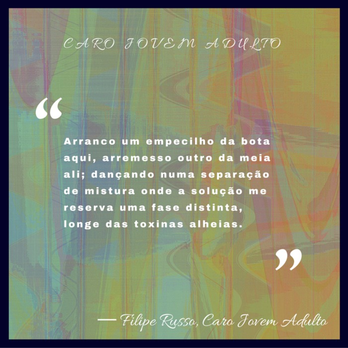 “Arranco um empecilho da bota aqui, arremesso outro da meia ali; dançando numa separação de mistura onde a solução me reserva uma fase distinta, longe das toxinas alheias.”